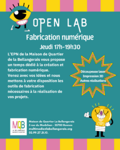 Découpeuse laser, impression 3D, réalisation et montage vidéo… Espace de création et lieu de ressources, l’EPN de la Maison de Quartier de la Bellangerais vous propose un temps dédié à la création et fabrication numérique. Venez avec vos idées et nous mettons à votre disposition les outils de fabrication nécessaires à la réalisation de vos projets. Nous sommes également disponibles à vous aider à prendre en main les outils fabrication de l’atelier numérique.